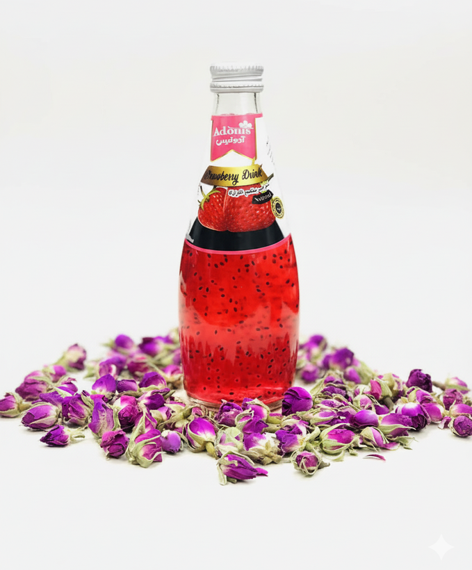 نوشیدنی توت فرنگی شرکت درین گلاب وآدونیس همراه با بذر ریحان بسیار خوش طعم و بدون رنگ مصنوعبی